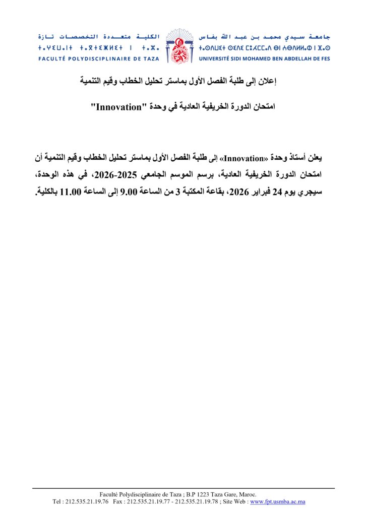 إعلان لطلبة الفصل الأول ماستر تحليل الخطاب وقيم التنمية امتحان الدورة الخريفية العادية – وحدة « Innovation »