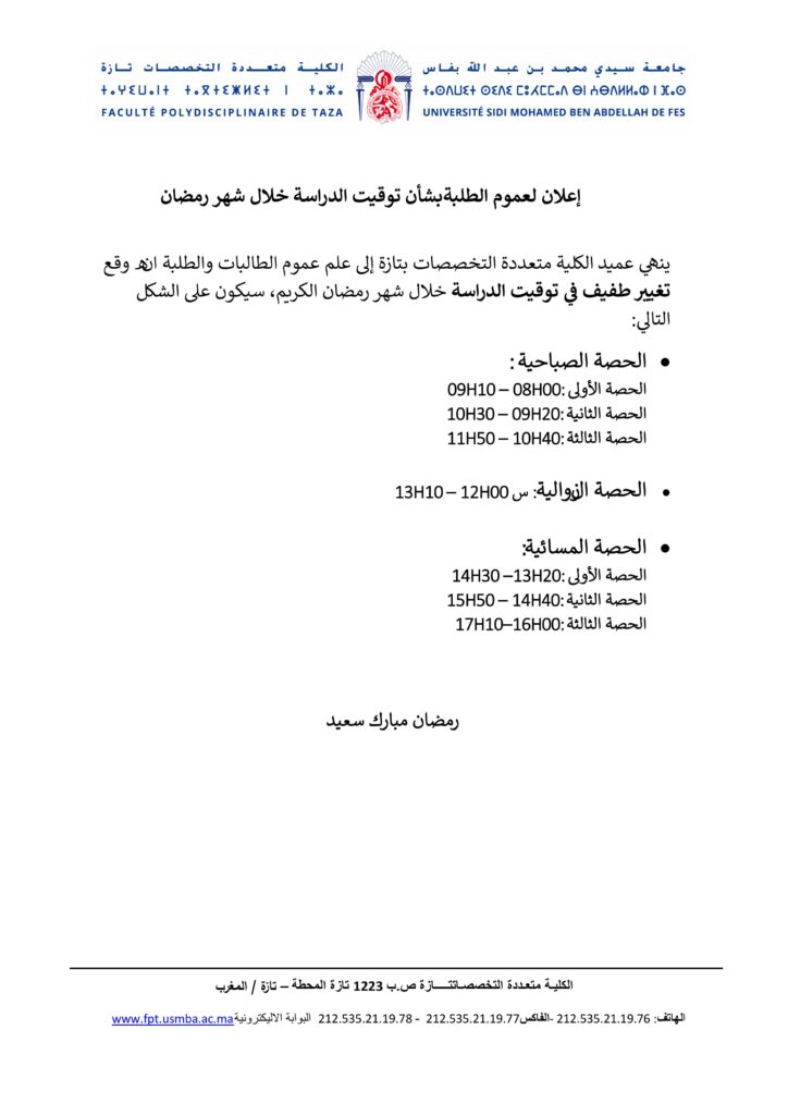 إعلان لعموم الطلبةبشأن توقيت الدراسة خلال شهر رمضان