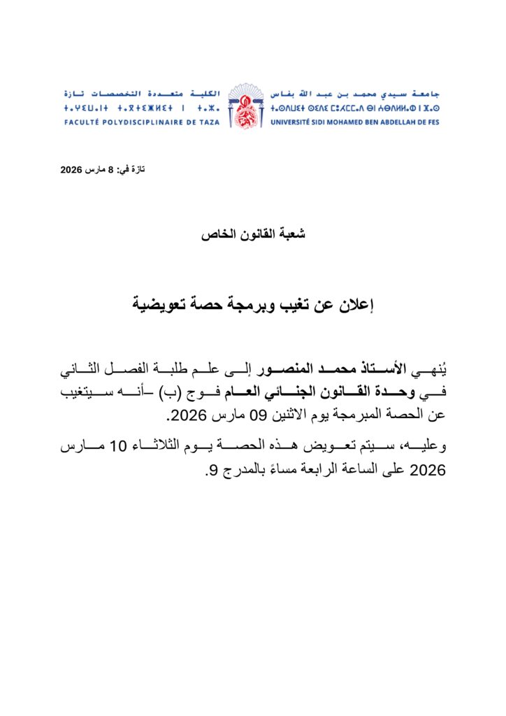 اعلان إلى علم طلبة الفصل الثاني في وحدة القانون الجنائي العام فوج (ب)