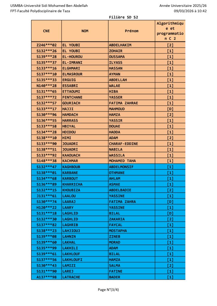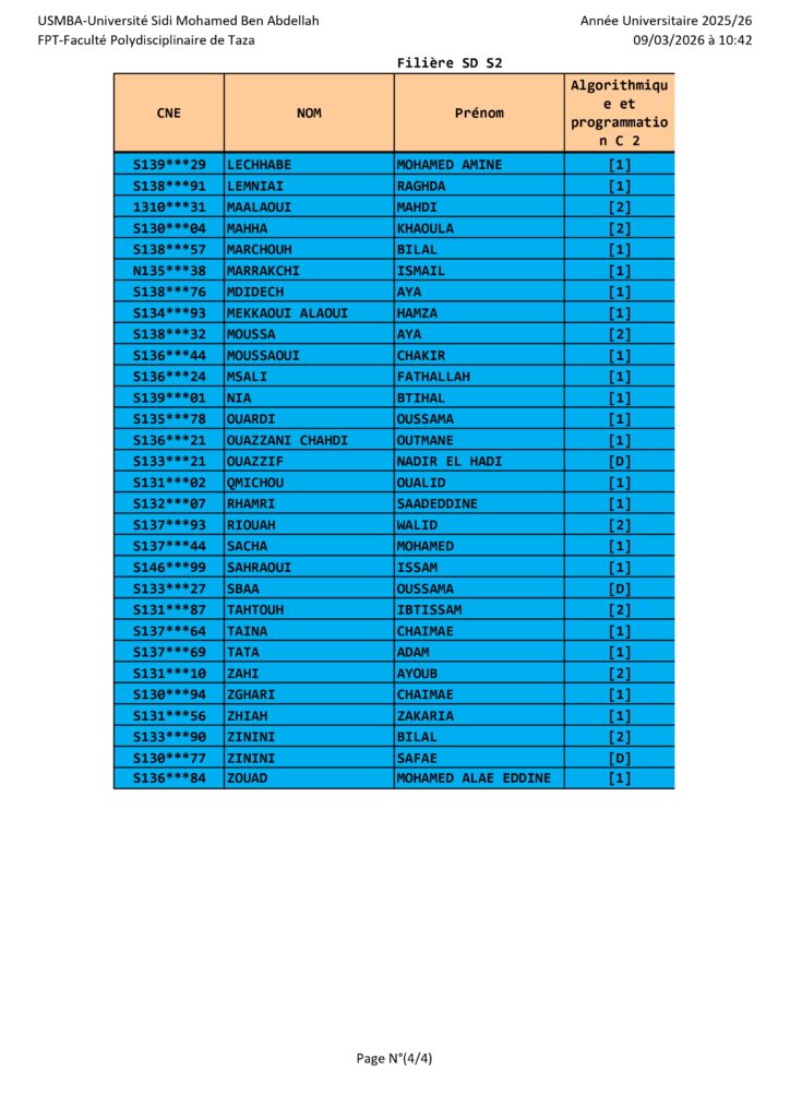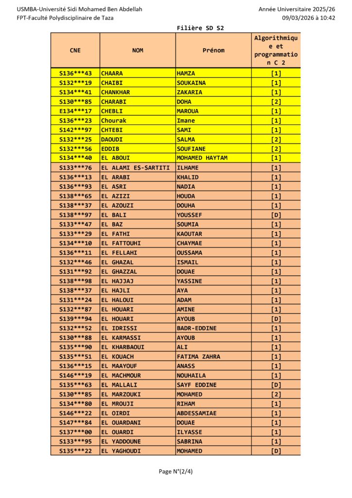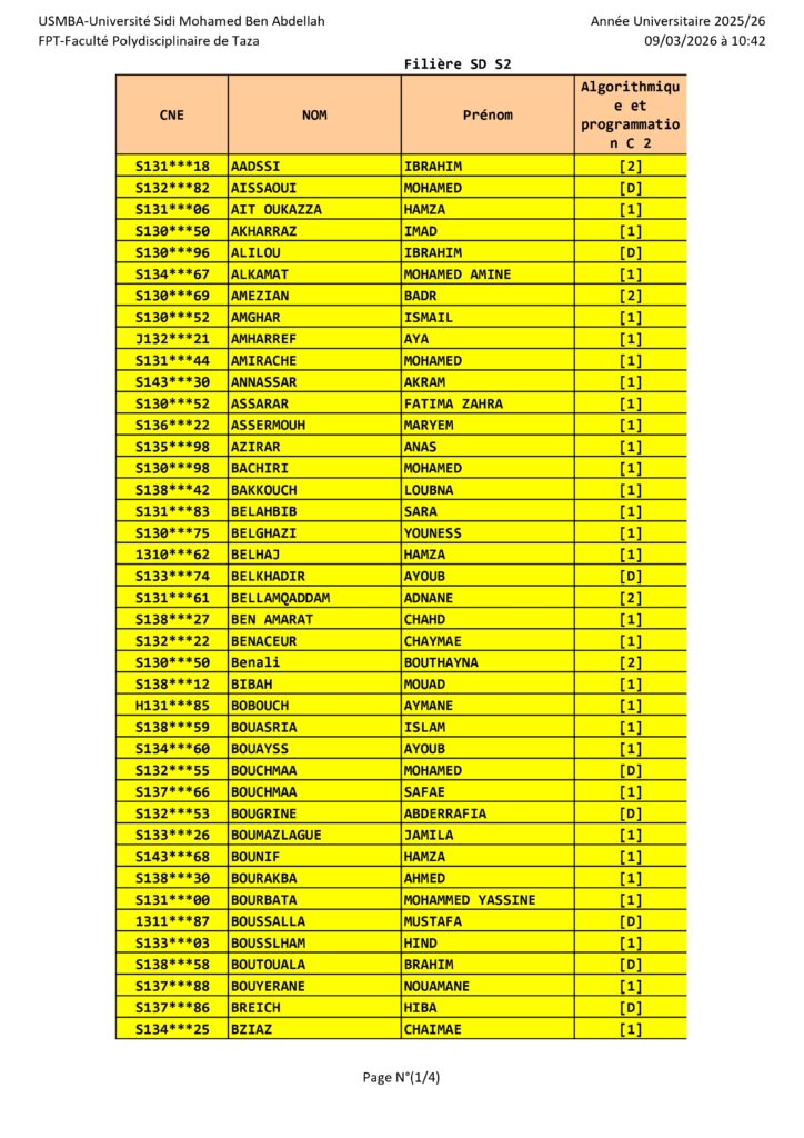 Avis aux étudiants de la Filière SD S2 – Groupe de TP – Module SD algo et programmation C2