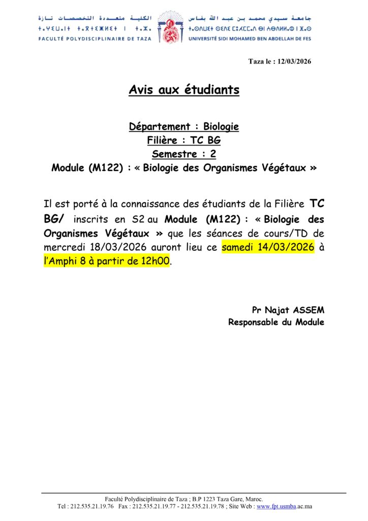 Avis aux étudiants de la Filière TC BG – S2 – Module Biologie des Organismes Végétaux