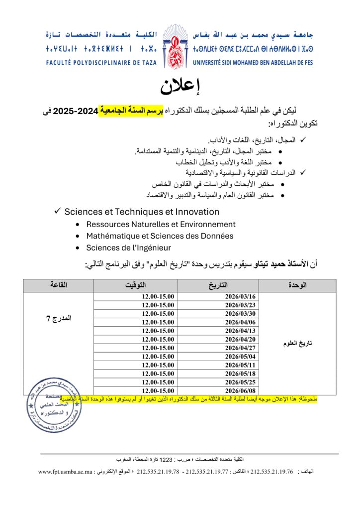 إعلان لطلبة المسجلين بسلك الدكتوراه – وحدة تاريخ العلوم
