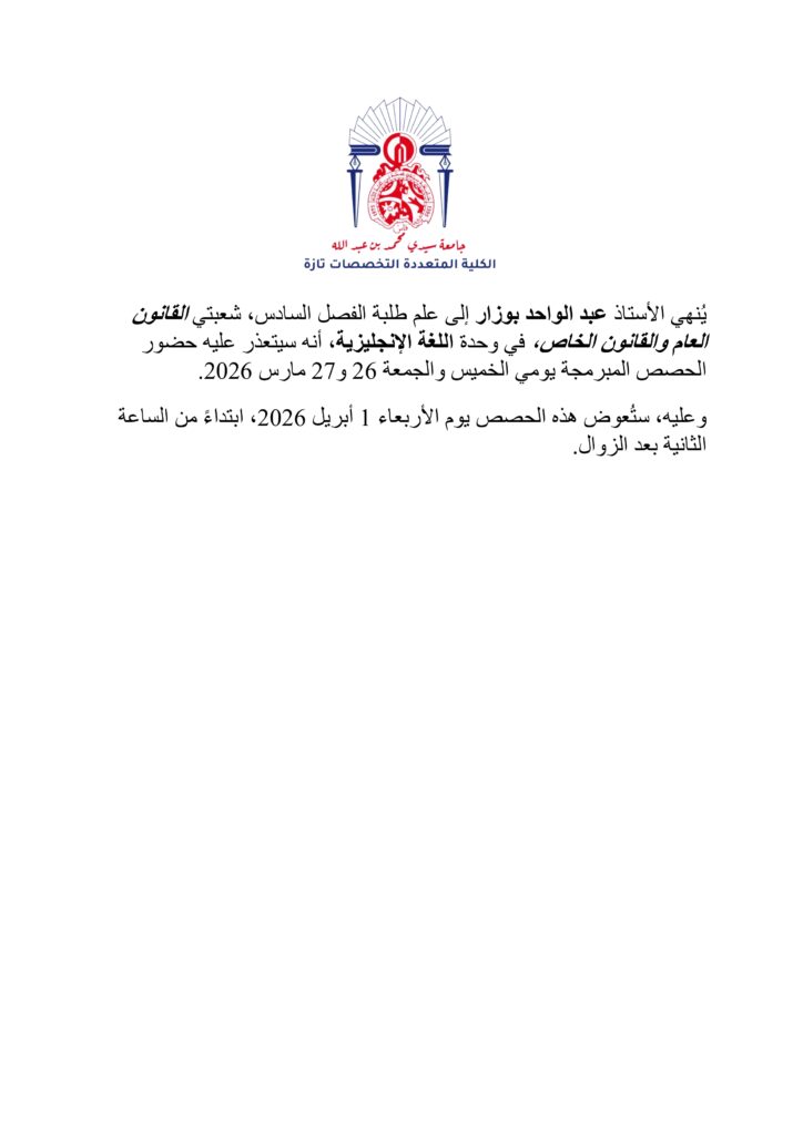 إعلان لطلبة الفصل السادس شعبتي القانون العام والقانون الخاص – وحدة اللغة الإنجليزية