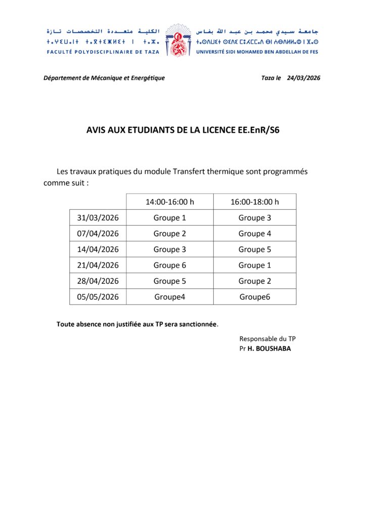 Avis aux Etudiants Département de Mécanique et Energétique  – filière Efficacité Énergétique et Énergies Renouvelables- Module Transfert thermique – S6
