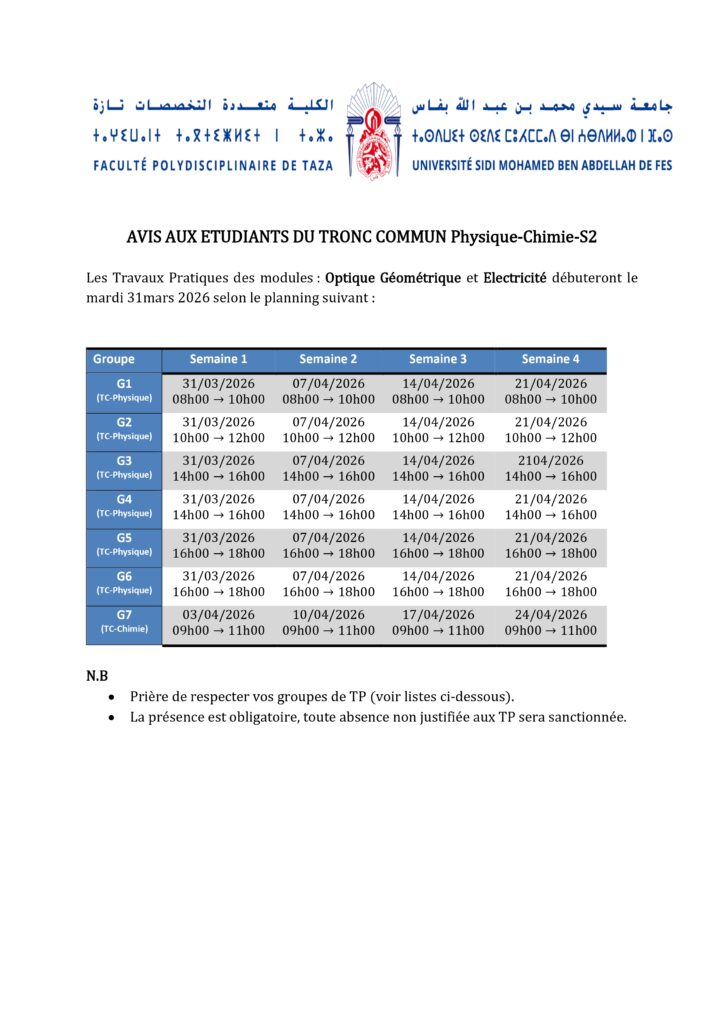 Avis aux Etudiants du Tronc Commun Physique-Chimie-S2 – Modules Optique Géométrique et Electricité