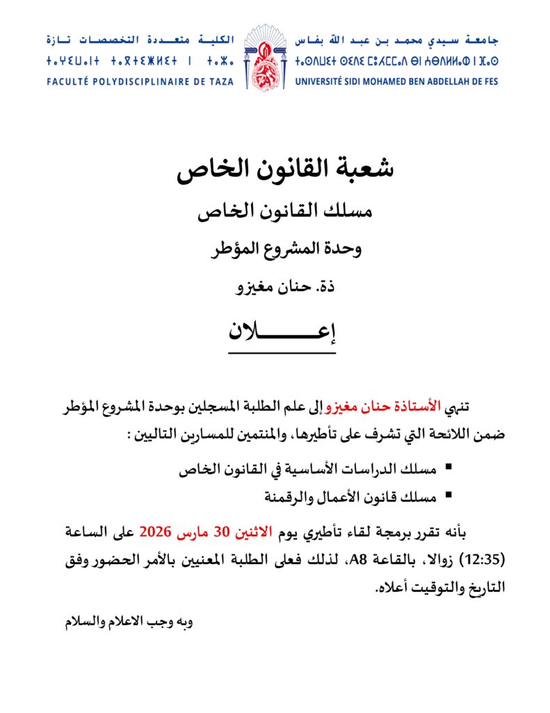 إعلان لطلبة شعبة القانون الخاص مسلك القانون الخاص وحدة المشروع المؤطر