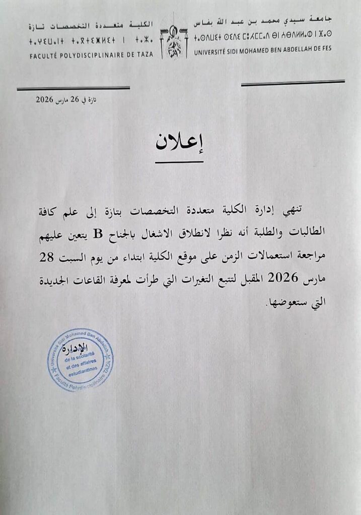 إعلان لفائدة الطلبة بخصوص استعمالات الزمن