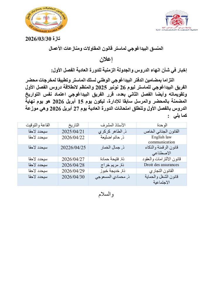 إعلان لطلبة ماستر قانون المقاولات ومنازعات الأعمال