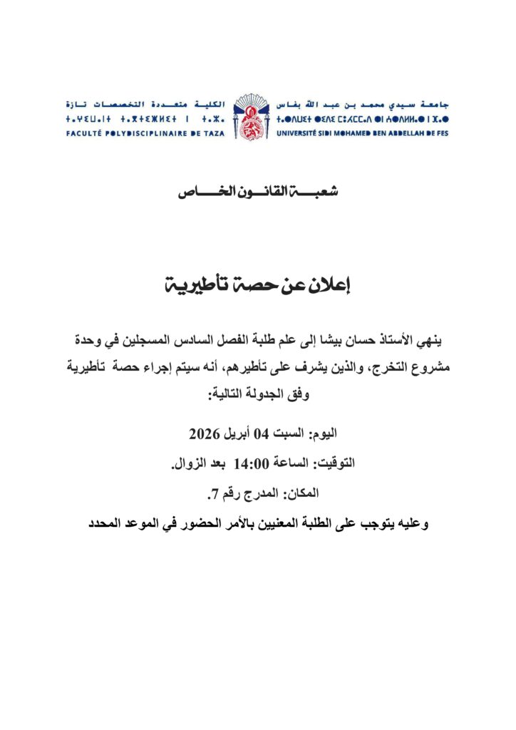 إعلان لطلبة شعبة القانون الخاص الفصل السادس وحدة مشروع التخرج