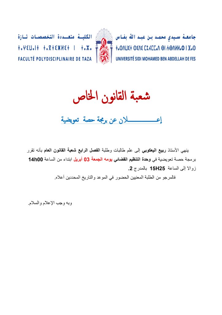 إعلان لطلبة شعبة القانون العام الفصل الرابع وحدة التنظيم القضائي