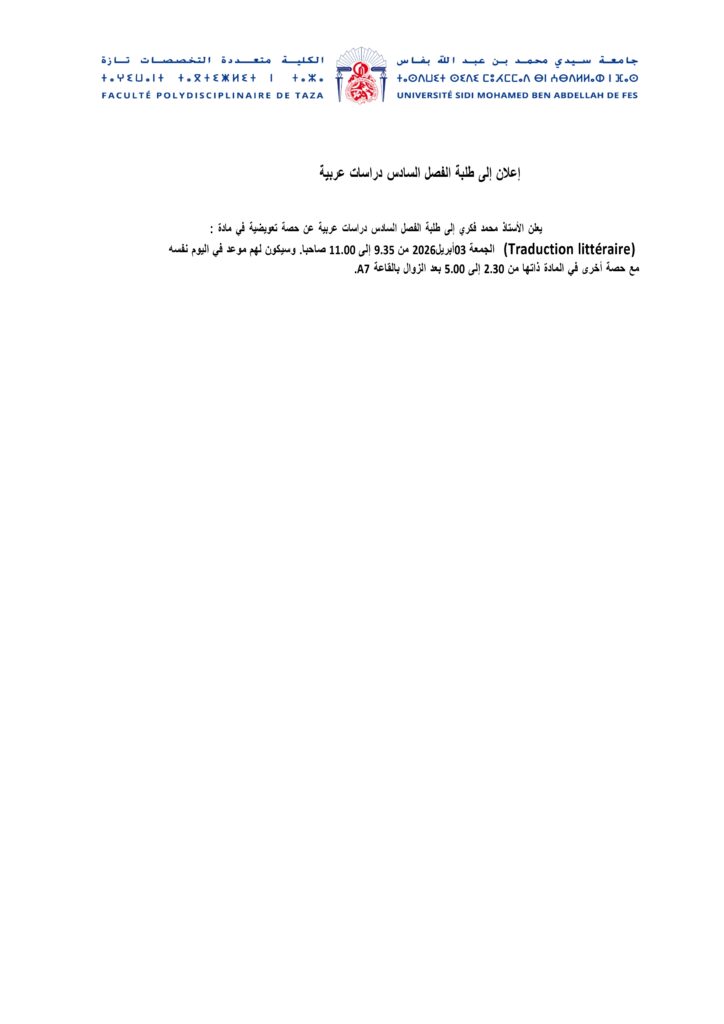 إعلان إلى طلبة الفصل السادس دراسات عربية وحدة Traduction Littéraire
