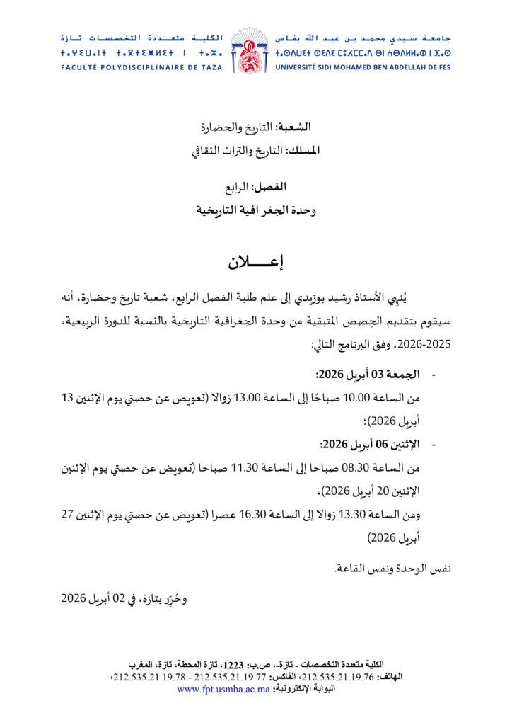إعلان لطلبة التاريخ والحضارة مسلك التاريخ والتراث الثقافي الفصل الرابع وحدة الجغرافية التاريخية