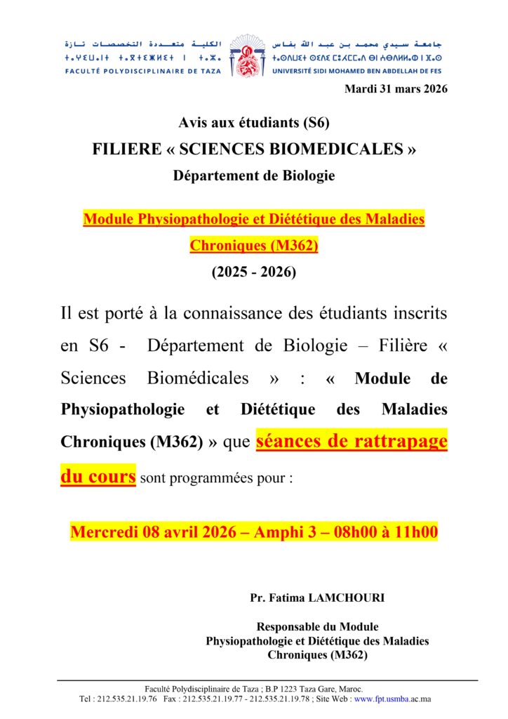 Avis aux étudiants de la Filière Sciences Biomédicales Module de Physiopathologie et Diététique des Maladies Chroniques – (S6)