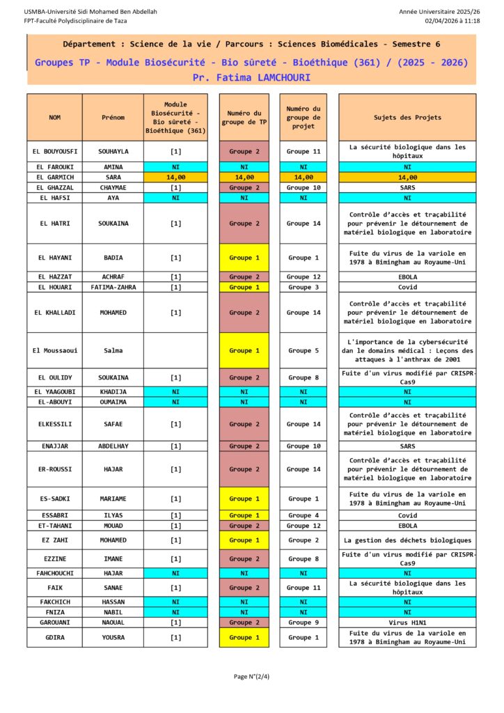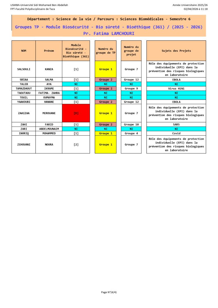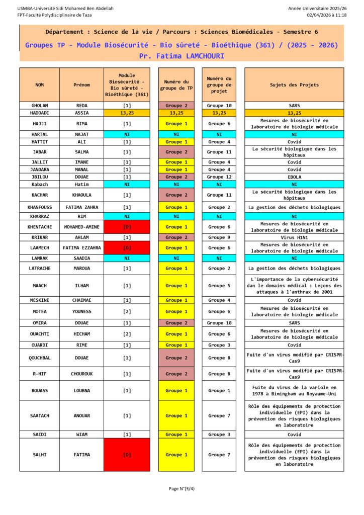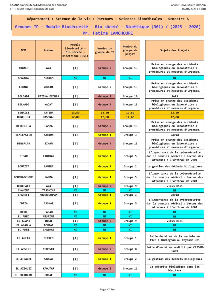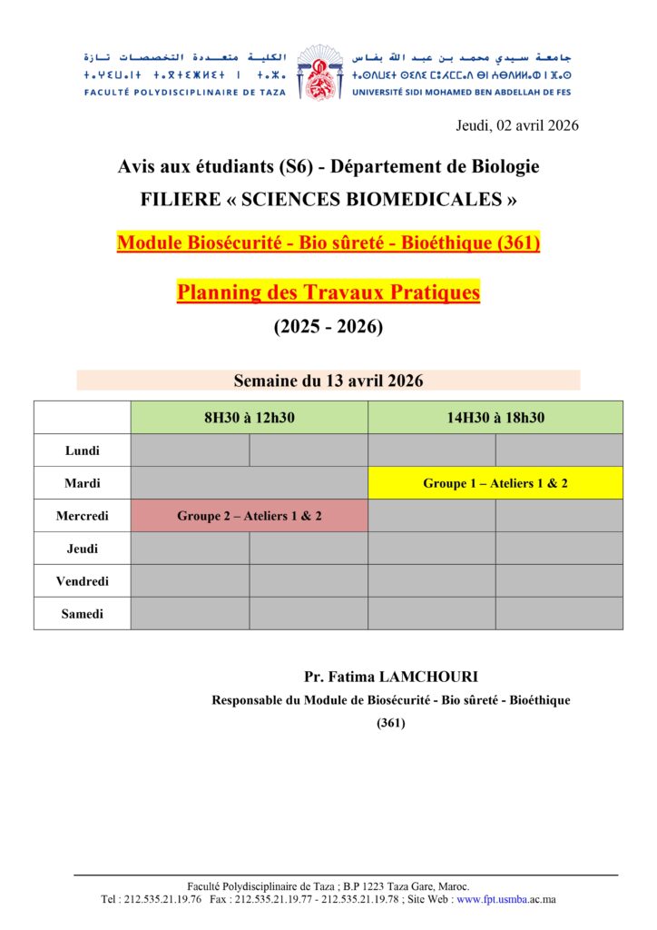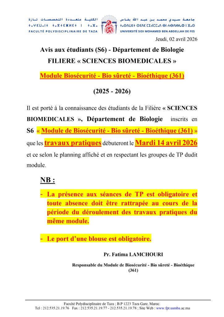 Avis aux étudiants de la Filière « Sciences Biomédicales » Travaux pratiques du  Module Biosécurité – Bio sûreté – Bioéthique – S6