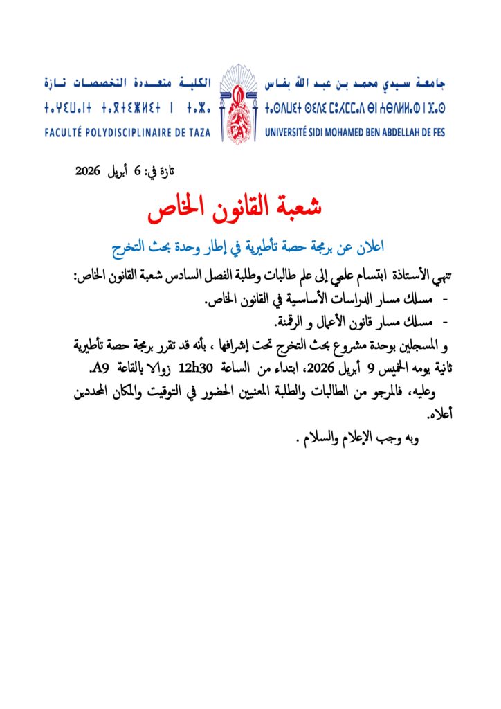 إعلان لطلبة الفصل السادس المسجلين بوحدة مشروع بحث التخرج لمساري الاجازة (مسلك الدراسات الأساسية في القانون الخاص،  مسلك قانون الأعمال و الرقمنة)