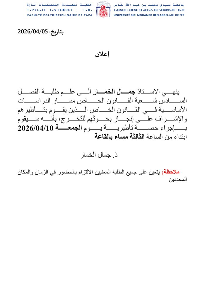 إعلان لطلبة الفصل السادس شعبة القانون الخاص مسار الدراسات الأساسية في القانون الخاص