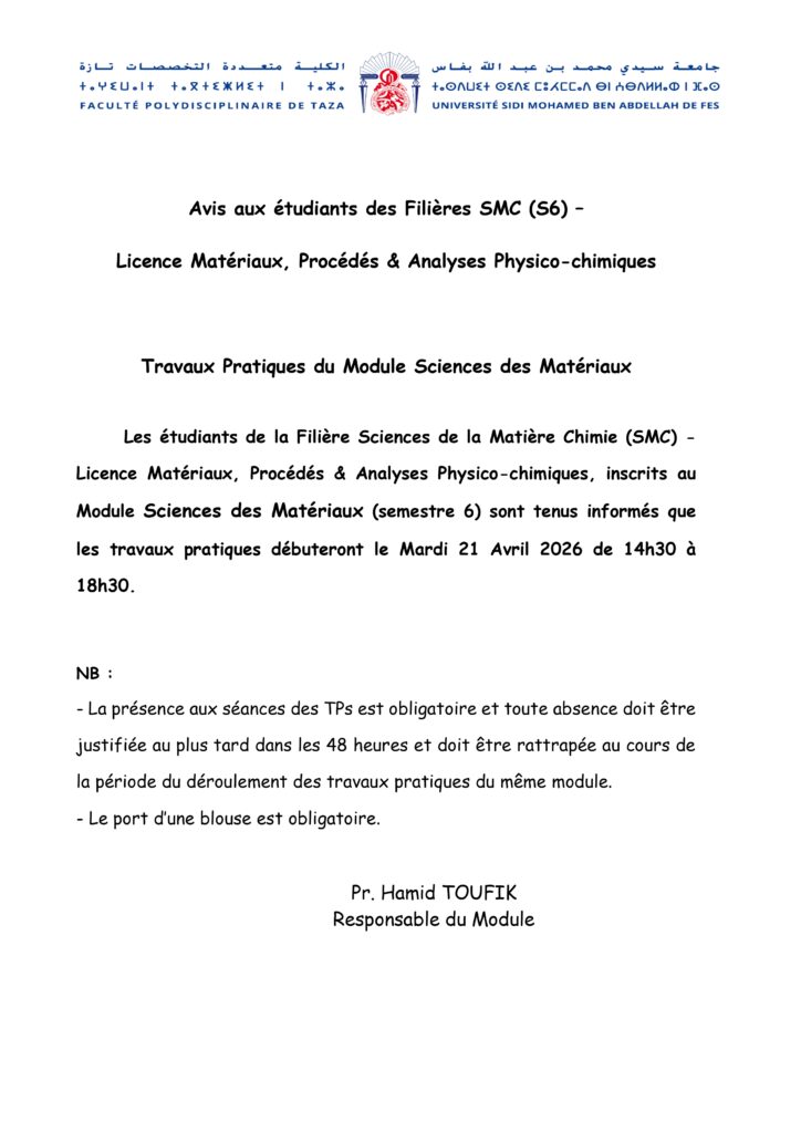 Avis aux étudiants de la Filière Matériaux, Procédés & Analyses Physico-chimiques Travaux Pratiques du Module Sciences des Matériaux – S6
