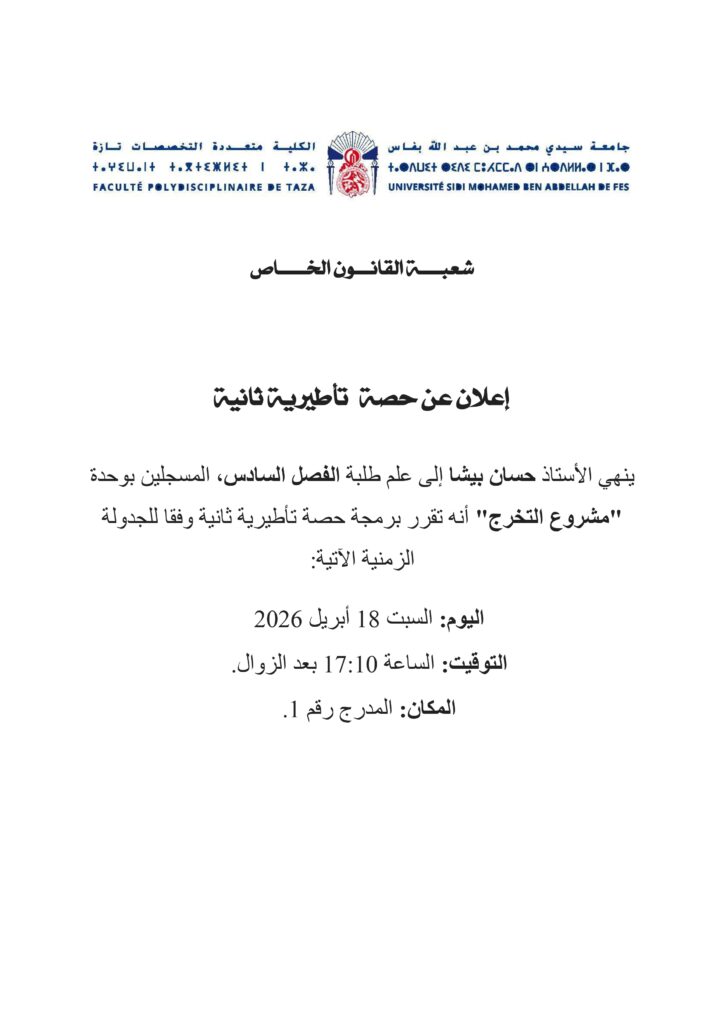 إعلان لطلبة شعبة القانون الخاص الفصل السادس وحدة مشروع التخرج