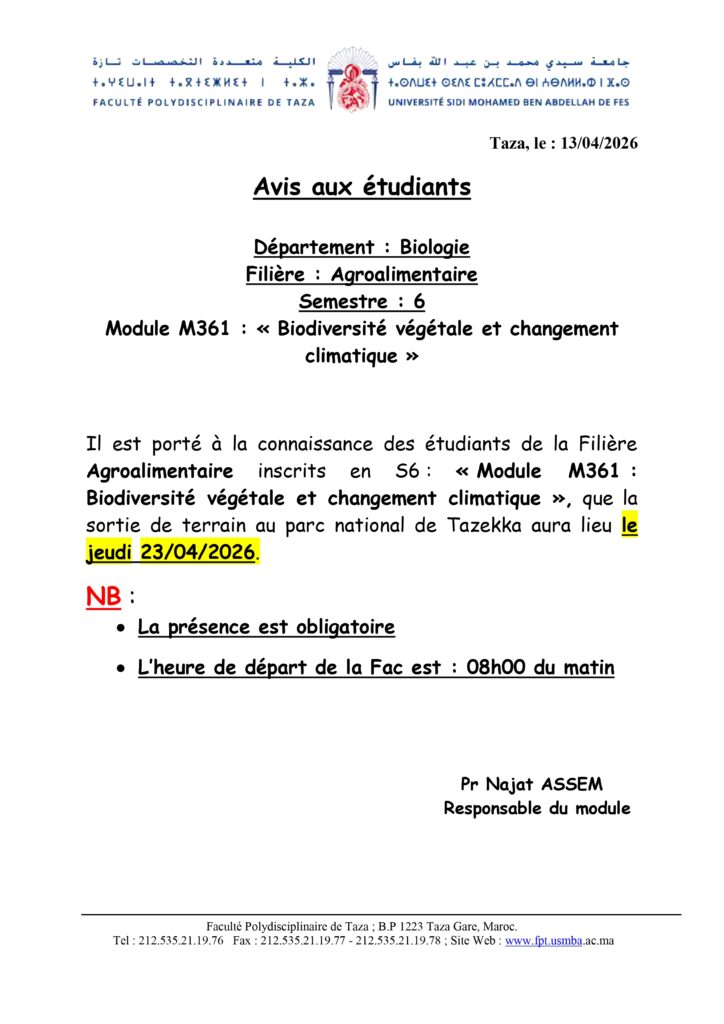 Avis aux étudiants de la Département Biologie Filière Agroalimentaire – Module Biodiversité végétale et Changement Climatique – S6