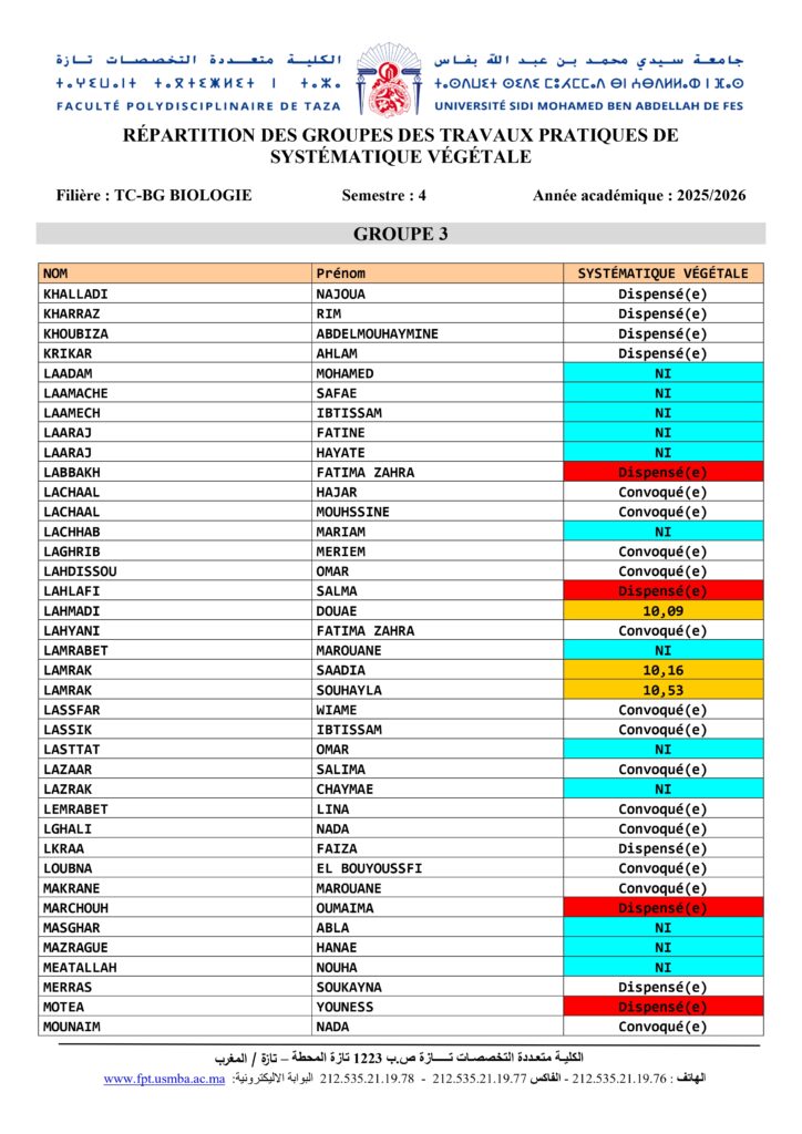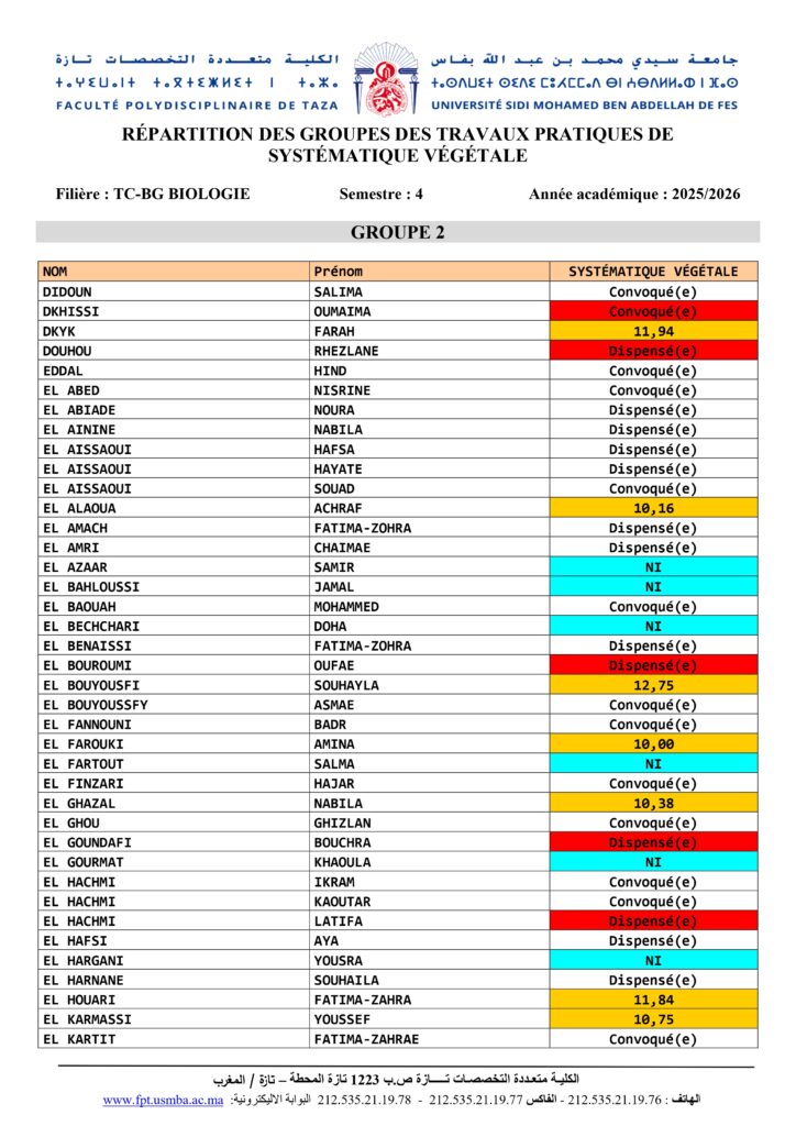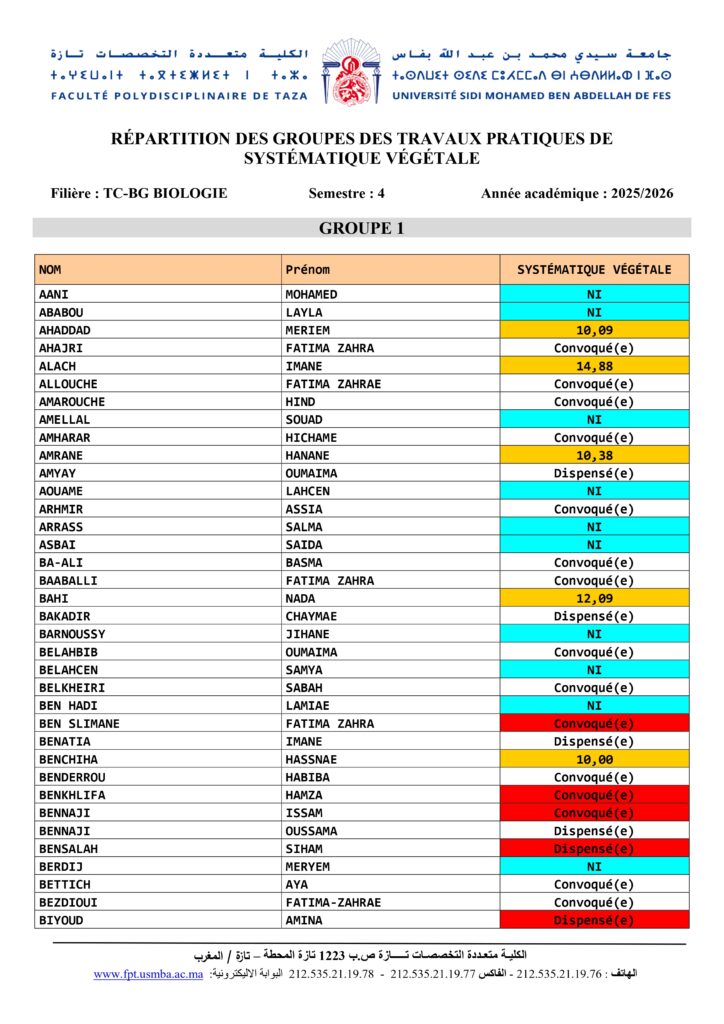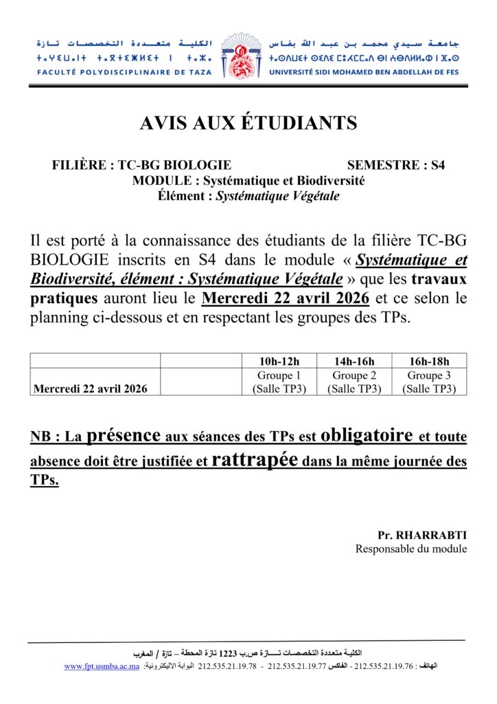 Avis aux étudiants de la Filière TC-BG Biologie Module Systématique et Biodiversité élément Systématique Végétale – S4