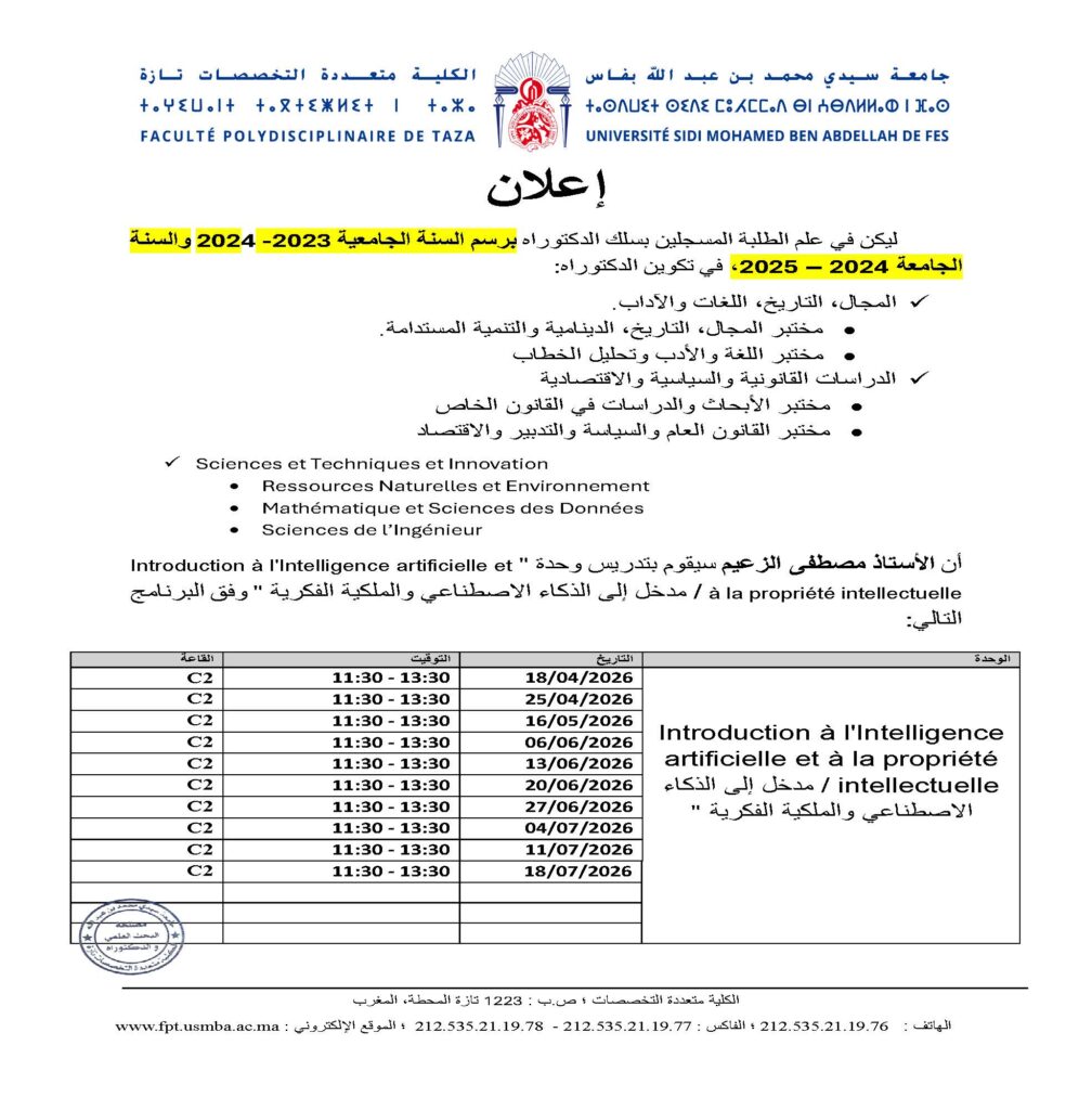 إعلان لطلبة المسجلين بسلك الدكتوراه – وحدة مدخل إلى الذكاء الاصطناعي والملكية الفكرية