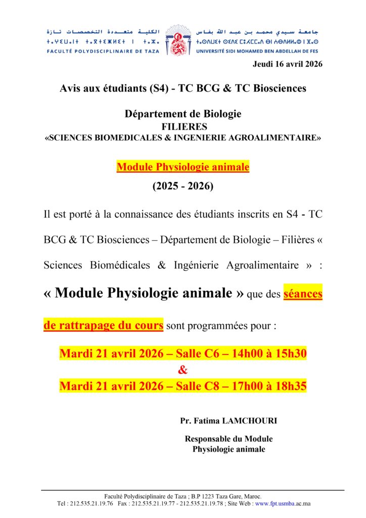 Avis aux étudiants – TC BCG & TC Biosciences Département de Biologie – Filières «Sciences Biomédicales & Ingénierie Agroalimentaire» Module de Physiologie animale – S4