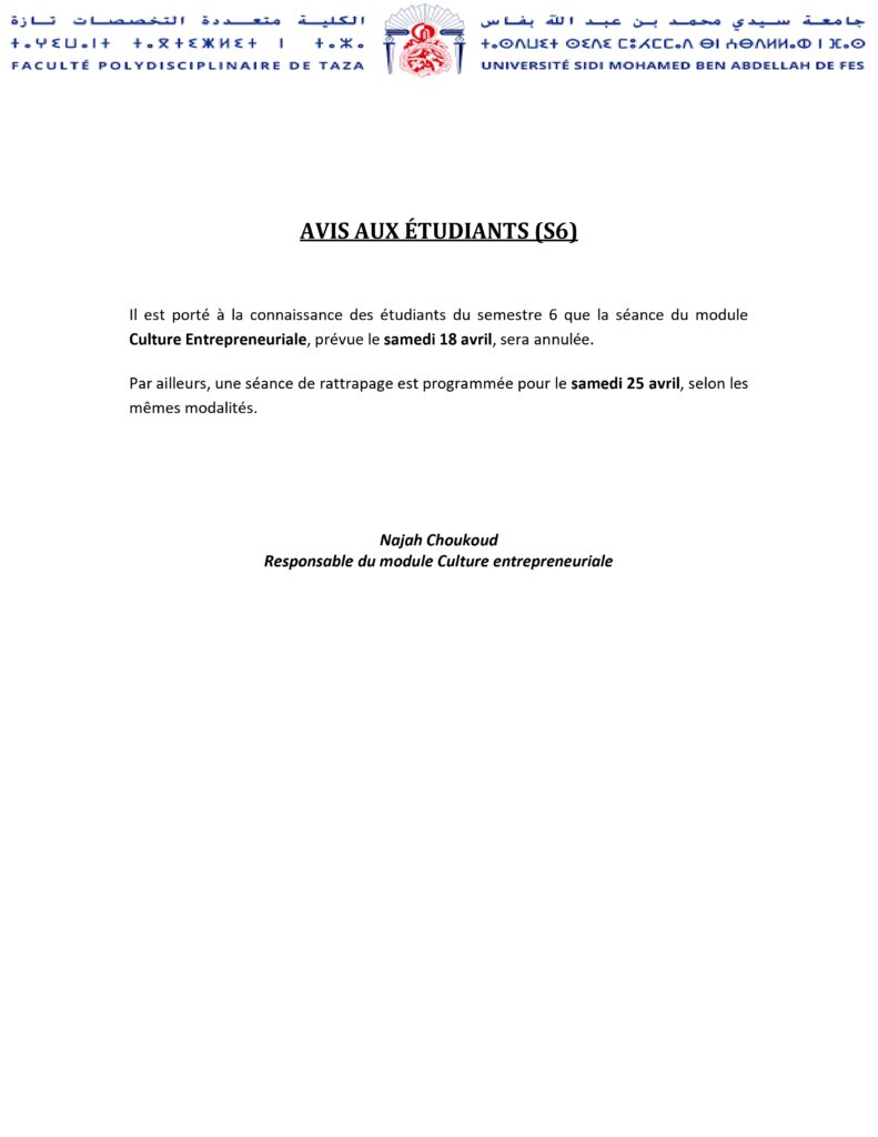 Avis aux étudiants S6 – Module Culture Entrepreneuriale
