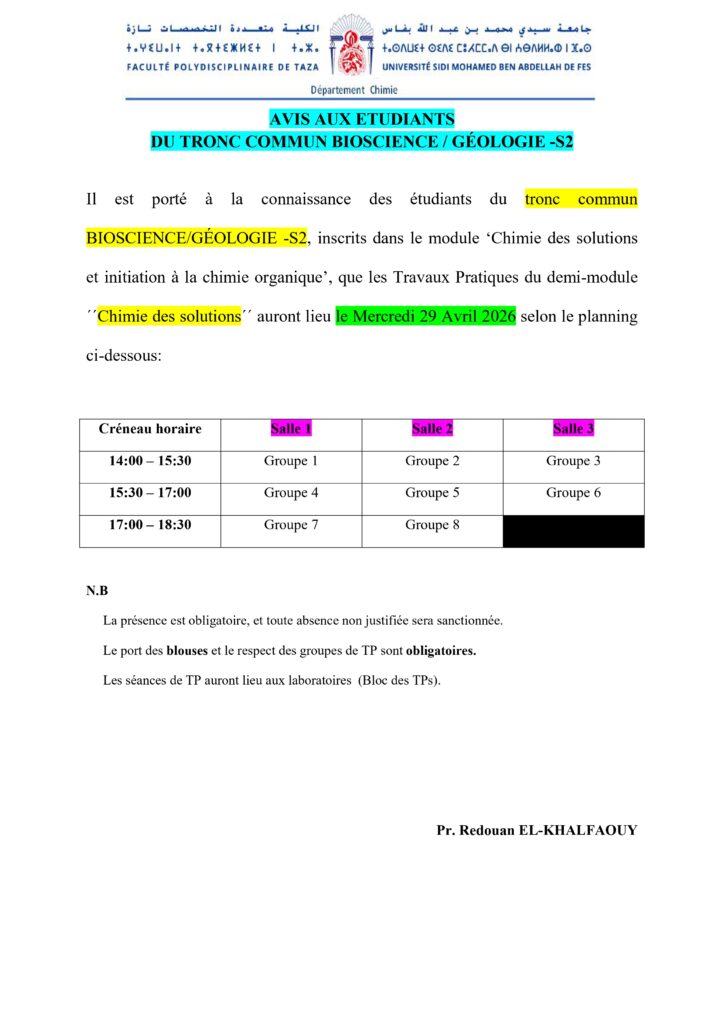 Avis de TP Aux Etudiants du Tronc Commun Bioscience / Géologie – S2