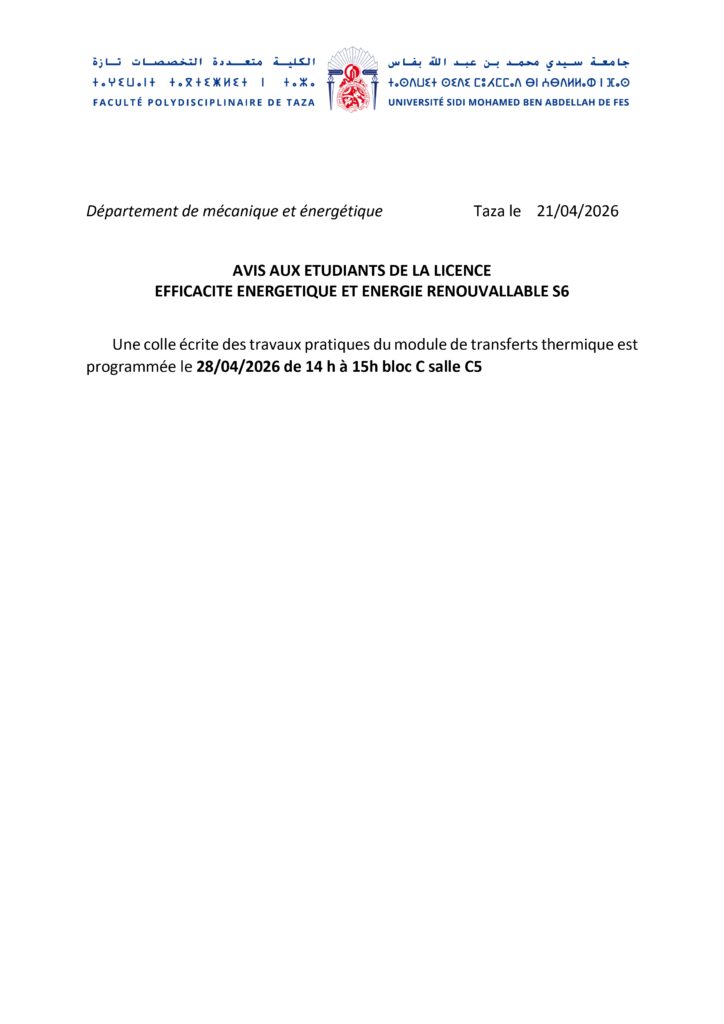 Avis aux étudiants de la Filière Efficacité Energétique et Energie Renouvelable Module de transferts thermique – S6