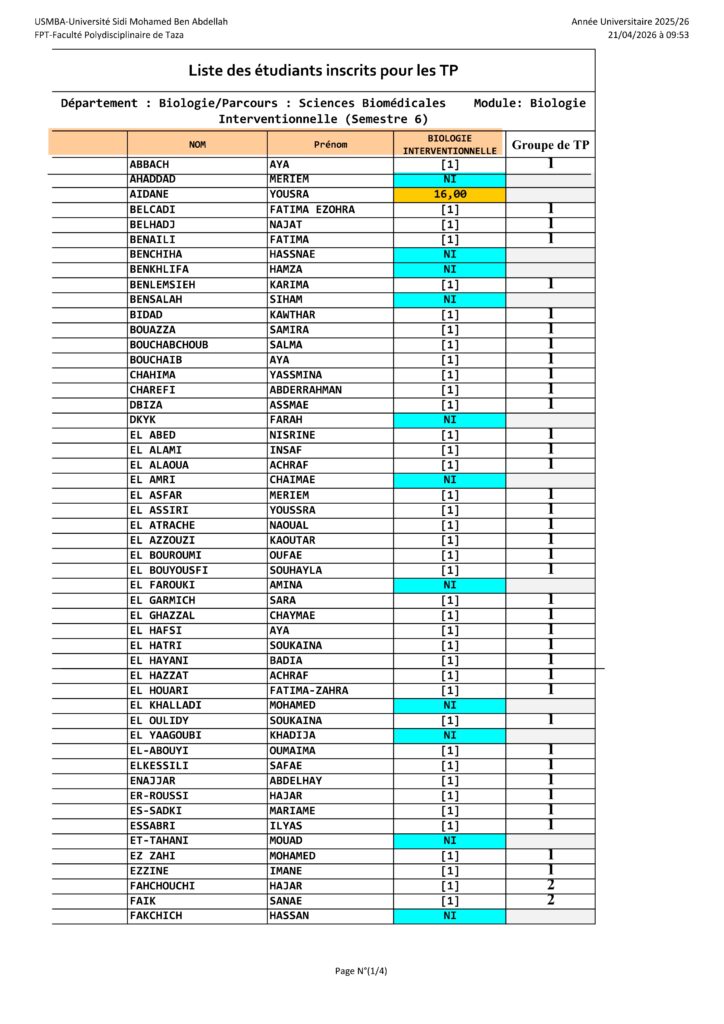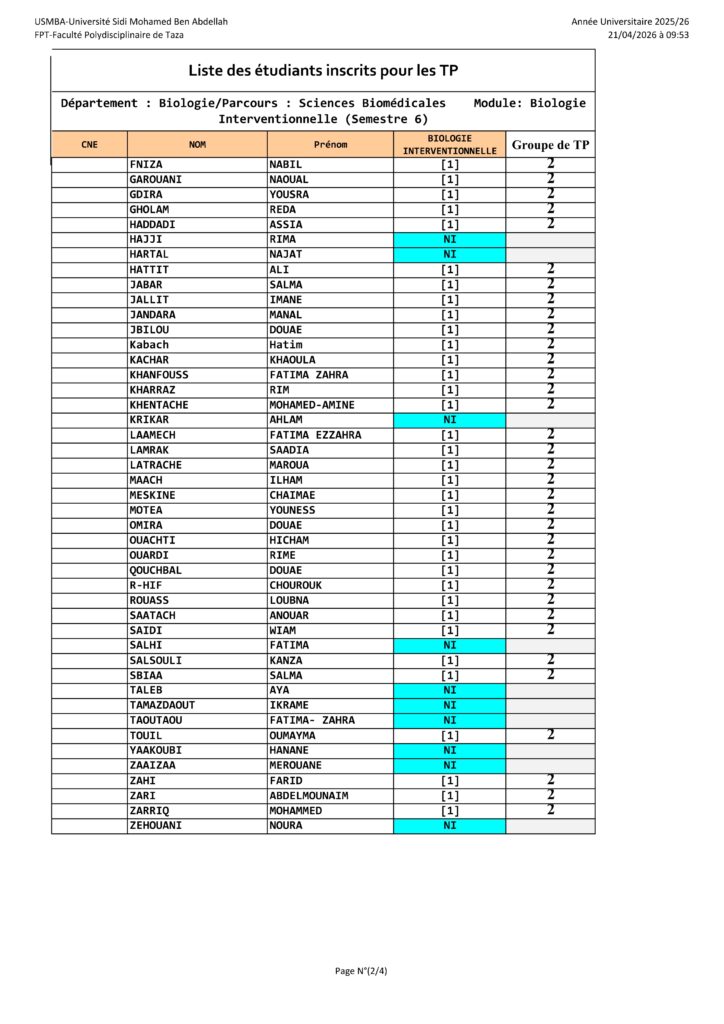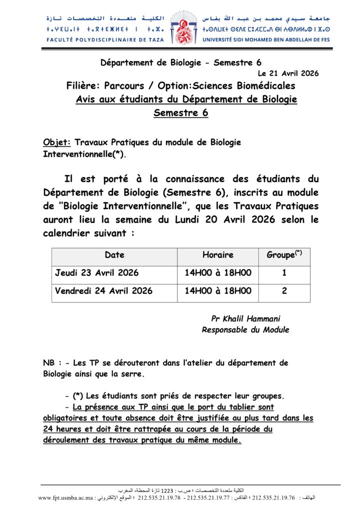 Avis aux étudiants de la Filière Biologie Parcours / Option Sciences Biomédicales – Travaux Pratiques du module de Biologie Interventionnelle – S6