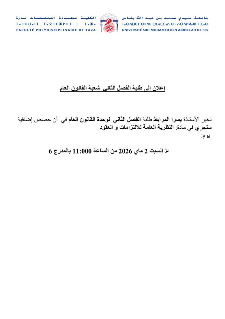 إعلان إلى طلبة الفصل الثاني شعبة القانون العام وحدة النظرية العامة لاللتزامات و العقود