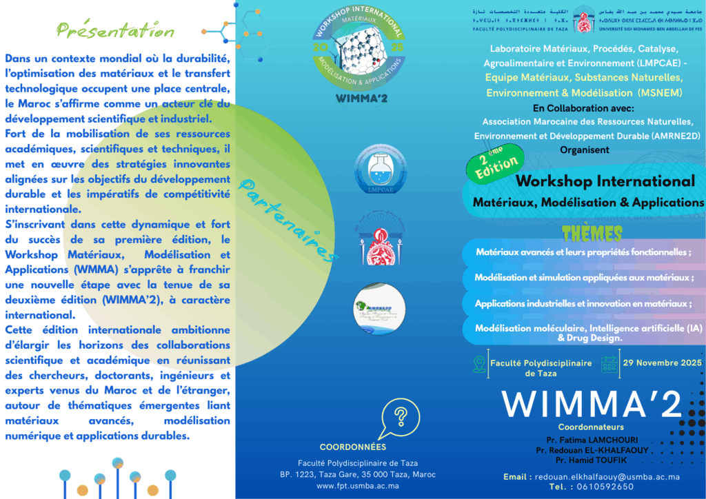 Nous avons le grand plaisir de vous inviter à participer à la 2ème édition du Workshop International Matériaux, Modélisation et Applications (WIMMA’2 – 2025), qui se tiendra le 29 Novembre 2025 à la Faculté Polydisciplinaire, Université Sidi Mohamed Ben Abdellah – Taza, Maroc.